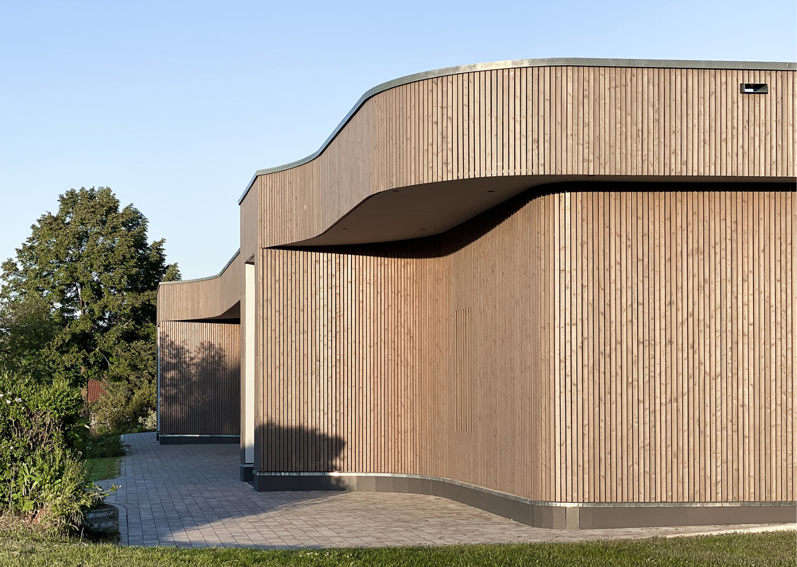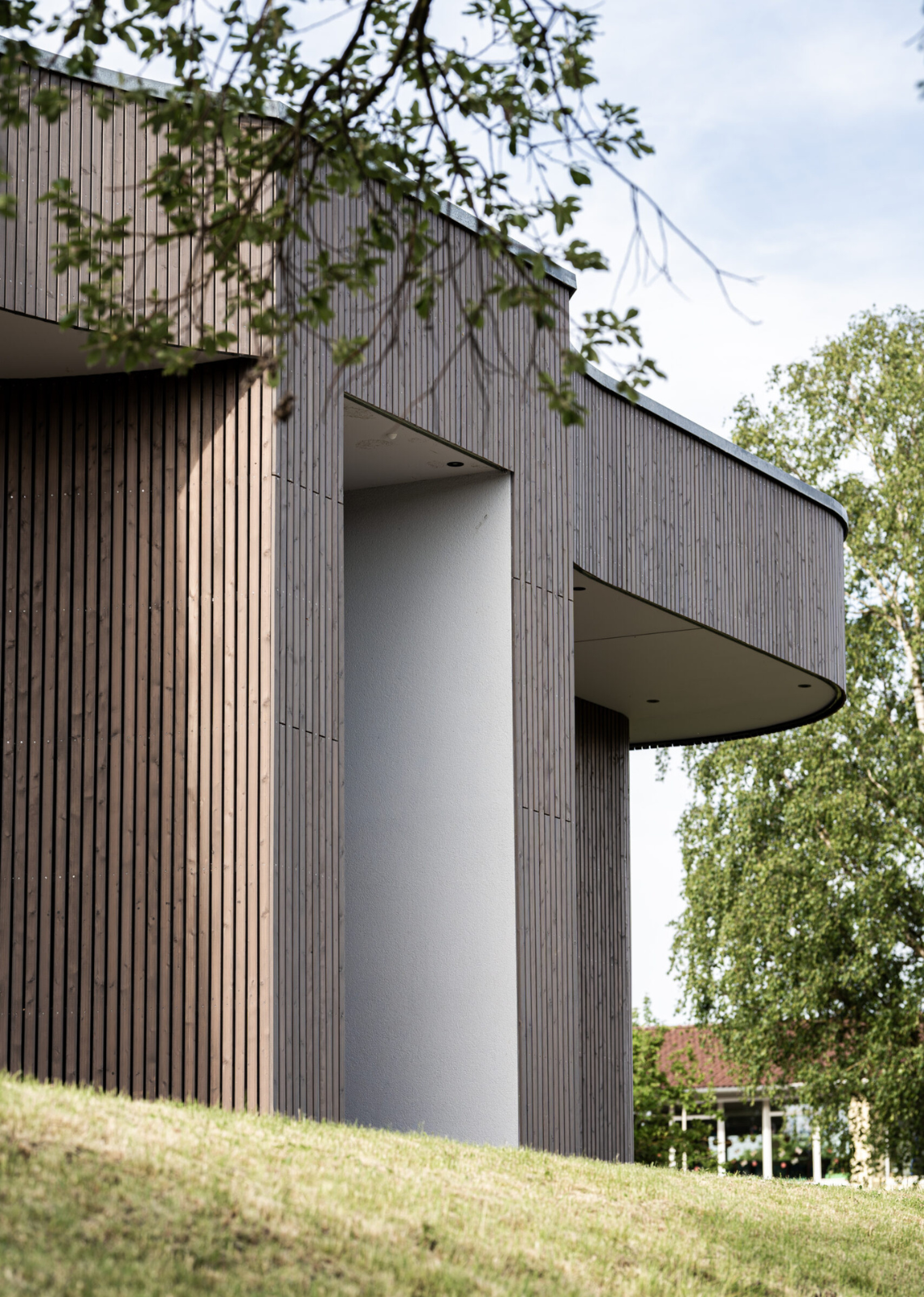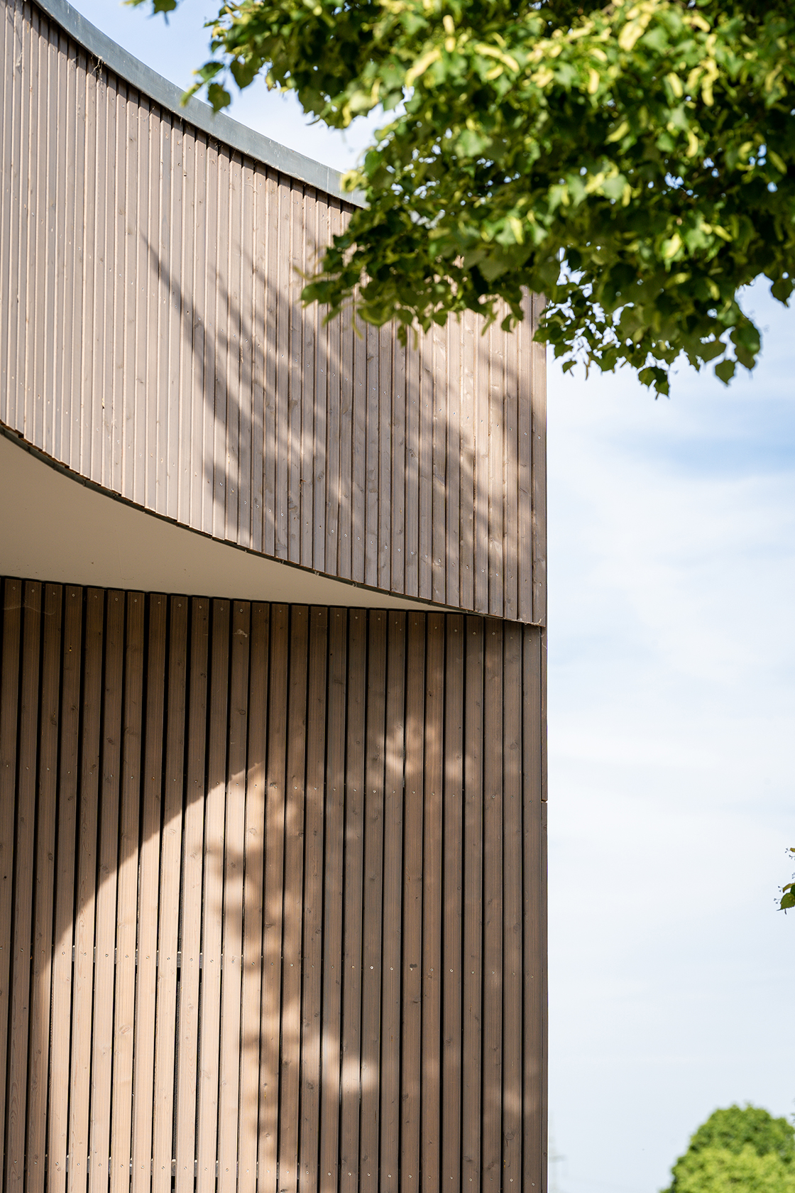 Die Außenhaut des Bauwerks ist mit einer vorgegrauten Lärchenholz-Schalung vorgesehen; die Holzprofile sind mit Abstand zueinander angeordnet, dahinter befindet sich eine Lüftungsebene. Die darauffolgende Wärmedämmung wird durch einen anthrazitfarbenen Flies abgedeckt und bildet die umlaufende Schale vor der oben genannten Lüftungsebene.